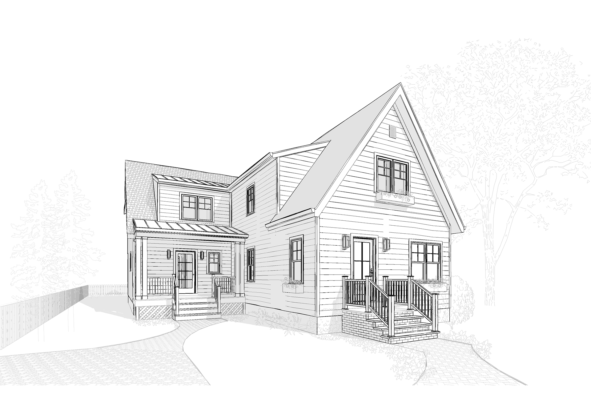 A transformation of an original, summer bungalow to a year-round residence for a grown family includes a new side porch with entry into a new mudroom, a necessity to keep organized. Open concept living, kitchen and dining space is optimized for entertaining, with a separate multi-purpose room with ensuite bath for cozy and quiet activities and guests. A corner dormer creates space for 4 bedrooms, 2 baths and laundry on the 2nd floor. A covered deck extends living space extends into the rear yard in warmer seasons.
